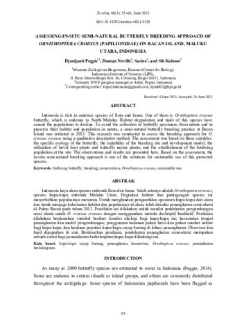 Djunijanti, Peggie and Duncan, Neville and Sarino, Sarino and Sih, Kahono (2021) Assessing in-situ semi-natural butterfly breeding approach of Ornithoptera croesus (Papilionidae) on Bacan Island, Maluku Utara, Indonesia. TREUBIA, 48 (1): 4. pp. 55-68. ISSN 0082-6340