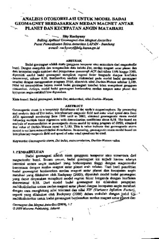 Badai geomagnet adalah suatu gangguan temporer atau sementara dari magnetosfer bumi. Dengan mengolah dan menganalisis data indeks Dst, medan magnet antar planet dan data kecepatan angin matahari dari pengamatan spacecraft ACE dari tahun 1998 hingga 2000, diperoleh model badai geomagnet mengikuti regresi linier berganda dengan koefisien determinasi, sebesar 0.58. berdasarkan analisis otokorelasi pada model badai geomagnet tersebut dengan menggunakan program SPSS, diperoleh nilai Durbin-Watson sebesar 2,189. Nilai ini menunjukkan bahwa model badai geomagnet tersebut tidak mengalami gangguan otokorelasi. Artinya, model badai geomagnet berdasarkan medan magnet antar planet dan kecepatan angin matahari bisa digunakan.