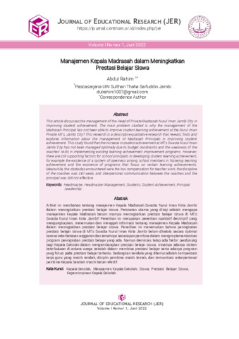 Artikel ini membahas tentang manajemen Kepala Madrasah Swasta Nurul Iman Kota Jambi dalam meningkatkan prestasi belajar siswa. Persoalan utama yang dikaji adalah mengapa manajemen Kepala Madrasah belum mampu meningkatkan prestasi belajar siswa di MTs Swasta Nurul Iman Kota Jambi? Penelitian ini merupakan penelitian kualitatif deskriptif yang mengungkapkan, menemukan dan menggali informasi tentang manajemen Kepala Madrasah dalam meningkatkan prestasi belajar siswa. Penelitian ini menemukan bahwa peningkatan prestasi belajar siswa di MTs Swasta Nurul Iman Kota Jambi belum dikelola secara optimal karena keterbatasan anggaran dan lemahnya kecakapan pembina dalam mengimplementasikan program peningkatan prestasi belajar yang ada. Namun demikian, tetap ada faktor pendukung bagi Kepala Sekolah dalam mengembangkan prestasi belajar siswa, misalnya adanya sistem keterbukaan di antara warga sekolah dalam membina prestasi belajar serta adanya program yang fokus pada prestasi belajar tertentu. Sedangkan kendala yang ditemui adalah kompensasi kerja guru yang masih rendah, disiplin pembina masih lemah, dan komunikasi antar personal pembina-Kepala Sekolah masih belum efektif.