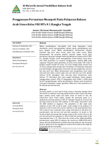 Annisa and Ela Isnani Munawwaroh and Syarifah (2021) Penggunaan permainan monopoli pada pelajaran bahasa Arab siswa kelas VIII MTs N 1 Bangka Tengah. Al-Mu'arrib: Jurnal Pendidikan Bahasa Arab, 1 (2). pp. 16-28. ISSN 2809-3186