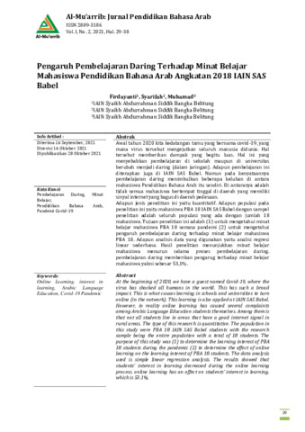 Firdayanti and Syarifah and Muhamad (2021) Pengaruh pembelajaran daring terhadap minat belajar mahasiswa pendidikan bahasa Arab angkatan 2018 IAIN SAS Babel. Al-Mu'arrib: Jurnal Pendidikan Bahasa Arab, 1 (2): 3. pp. 29-38. ISSN 2809-3186