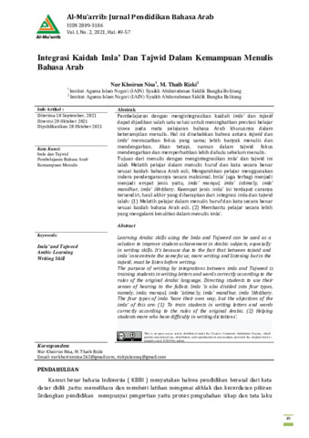 Nur Khoirun Nisa and M. Thaib Rizki (2021) Integrasi kaidah imla’ dan tajwid dalam kemampuan menulis bahasa Arab. Al-Mu'arrib: Jurnal Pendidikan Bahasa Arab, 1 (2): 5. pp. 49-57. ISSN 2809-3186