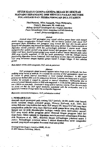 Anomali sinyal ULF geomagnet yang terjadi sebelum gempa besar telah banyak diteliti dengan menggunakan berbagai metoda. Hal ini karena anomali pada sinyal ULF geomagnet dapat disebabkan oleh gangguan yang berasal dari luar dan bersifat global maupun oleh gangguan yang berasal dari dalam bumi yang sifatnya lokal. Dalam makalah ini digunakan metode polarisasi (Z/H) dan perbandingan polarisasi 2 stasiun untuk dapat memperkirakan apakah anomali yang terjadi berasal dari gangguan luar atau dalam bumi. Untuk studi kasus diambil gempa-gempa yang terjadi di sekitar stasiun Manado pada tahun 2008 yang memiliki magnitude >5 S.R dan jarak episenternya <200 km. Sebagai stasiun pembanding digunakan stasiun Pontianak. Dari studi kasus tersebut diperoleh anomali sinyal ULF yang berasosiasi dengan kejadian gempa terjadi 3 minggu hingga 10 hari sebelum gempa.