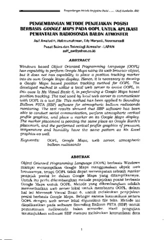 Object Oriented Piogramming Language (OOPL) berbasis Windows mampu menampilkan Google Maps menggunakan obyek web browsernya, tetapi OOPL tidak dapat menempatkan sebuah marker penjejak posisi ke dalam Google Maps yang ditampilkannya. Untuk itu perlu dikembangkan metode penjejakan posisi berbasis Google Maps untuk OOPL. Metode yang dikembangkan adalah memanfaatkan web server lokal untuk membantu OOPL, dalam hal ini Microsoft Visual Basic 6, untuk melakukan penjejakan posisi berbasis Google Maps. Sebagai sarana komunikasi antara OOPL dengan web server lokal digunakan file teks. Metode ini diaplikasikan pada software Sounding Balloon PSTA (SBP) untuk pemantauan radiosonda balon atmosfer. Hasil pengujian menunjukkan software SBP mampu melakukan komunikasi data serial,menampilkan grafik profil vertical atmosfer dan penempatan marker dalam Google maps. Hasil penempatan marker sama dengan hasil penempatan lacemark pada Google Earth. Grafik profil vertical tekanan, temperature dan kelembaban yang ditujukan juga sama dengan grafik yang ditampikan Ms Excel 2010.