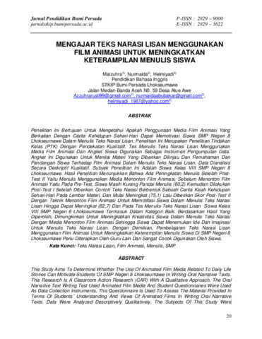 Maizuhra, Maizuhra and Nurmaida, Nurmaida and Helmiyadi, Helmiyadi (2022) Mengajar teks narasi lisan menggunakan film animasi untuk meningkatkan keterampilan menulis siswa. Jurnal Pendidikan Bumi Persada, 1 (1). pp. 20-30. ISSN 2829-9000