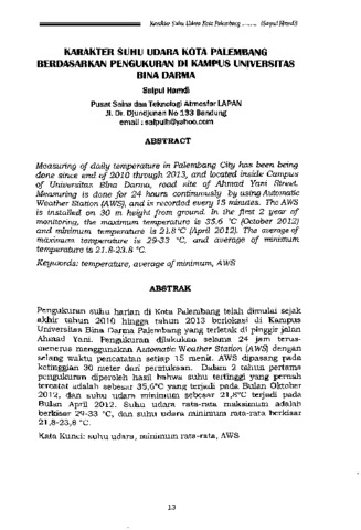 Saipul Hamdi (2013) Karakter suhu udara kota Palembang berdasarkan pengukuran di Kampus Universitas Bina Darma. In: Sains Atmosfer : Teknologi dan Aplikasinya. 1 ed. CV. Andira, Bandung, pp. 13-25. ISBN 978-979-1458-68-9