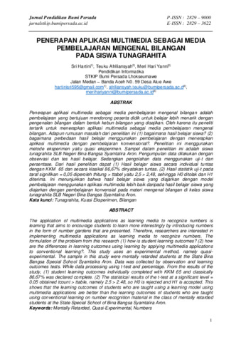 Sri, Hartini and Teuku, Afriliansyah and Meri, Hari Yanni (2022) Penerapan aplikasi multimedia sebagai media pembelajaran mengenal bilangan pada siswa tunagrahita. Jurnal Pendidikan Bumi Persada, 1 (1): 4. pp. 31-38. ISSN 2829-9000