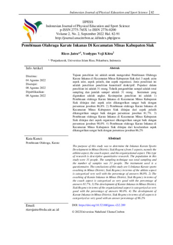 Rices, Jatra and Yonlygus, Veji Kitra (2022) Pembinaan olahraga karate Inkanas di Kecamatan Minas Kabupaten Siak. Indonesian Journal of Physical Education and Sport Science (IJPESS), 2 (2): 3. pp. 82-91. ISSN 2775-765x