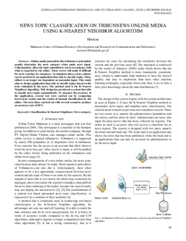Herman (2018) News topic classification on Tribunnews online media using K-Nearest Neighbor Algorithm. Journal of Information Technology and Its Utilization, 1 (2): 2. pp. 38-42. ISSN e- ISSN 2654-802X