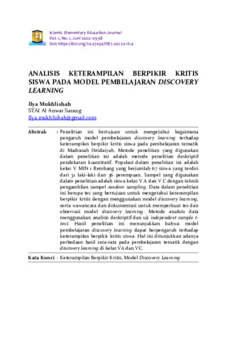 Ilya Mukhlishah (2022) Analisis keterampilan berpikir kritis siswa pada model pembelajaran discovery learning. Islamic Elementary Education Journal (IEEJ), 1 (1): 4. pp. 45-58. ISSN 2830-3792