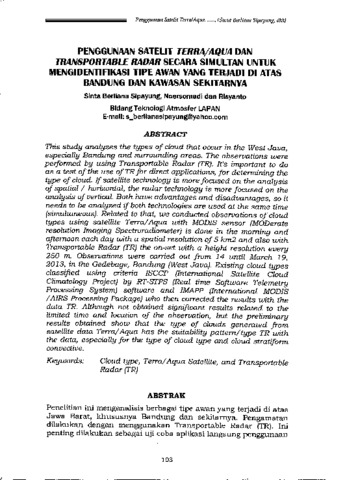 Penelitian ini menganalisis berbagai tipe awan yang terjadi di atas Jawa Barat, khususnya Bandung dan sekitarnya. Pengamatan dilakukan dengan menggunakan Transportable Radar (TR). Ini penting dilakukan sebagai uji coba aplikasi langsung penggunaan TR, untuk penentuan tipe awan. Jika teknologi satelit lebih difokuskan kepada analisis spasial, maka teknologi radar lebih difokuskan kepada analisis vertikal. Keduanya memiliki kelebihan dan kekurangan, sehingga perlu dianalisis jika kedua teknologi tersebut digunakan dalam waktu yang bersamaan (simultan). Terkait dengan itu, maka dilakukan pengamatan tipe awan menggunakan satelit Terra/Aqua dengan sensor MODIS (MODerateresolution Imaging Spectroradiometer) yang dilakukan pada pagi dan sore hari dengan resolusi spasial 5 km2 dan juga dengan Transportable Radar (TR) yang di-setting dengan resolusi ketinggian setiap 250 m. Pengamatan dilakukan sejak tanggal 14 sampai 19 Maret 2013, di kawasan Gedebage, Bandung (Jawa Barat). Tipe awan yang ada diklasifikasi menggunakan kriteria ISCCP (International Satellite Cloud Climatology Project) dengan perangkat lunak RT-STPS (Real time Software Telemetry Processing System) dan IMAPP (International MODIS /AIRS Processing Package) yang kemudian dikoreksi hasilnya dengan data TR. Walaupun belum diperoleh hasil yang cukup signifikan terkait dengan terbatasnya waktu dan lokasi pengamatan, namun hasil sementara yang diperoleh menunjukkan bahwa tipe awan yang dihasilkan dari data satelit Terra/Aqua memiliki kesesuaian pola/tipe dengan data Transportable Radar (TR), khususnya untuk tipe-tipe awan konvektiv dan awan stratiform.