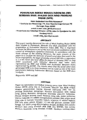 Robbi, Sudiantoro and Eddy, Hermawan (2013) Penyusunan Indeks Monsun Indonesia (IMI) berbasis hasil analisis data Wind Profiling Radar (WPR). In: Sains atmosfer : teknologi dan aplikasinya. CV. Andira, Bandung, pp. 124-140. ISBN 978-979-1458-68-9