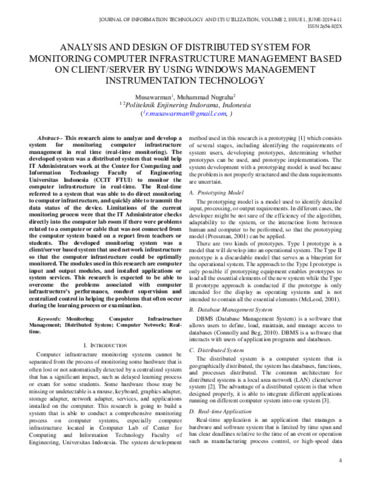 Musawarman, Musawarman and Muhammad, Nugraha (2019) Analysis and design of distributed system for monitoring computer infrastructure management based on client/server by using Windows management instrumentation technology. Journal of Information Technology and Its Utilization, 2 (1): 2. pp. 4-11. ISSN e-ISSN 2654-802X