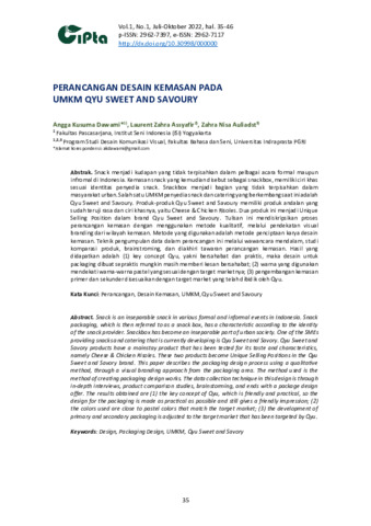 Angga, Kusuma Dawami and Laurent, Zahra Assyafir and Zahra, Nisa Auliadst (2022) Perancangan desain kemasan pada UMKM Qyu sweet and savoury. Cipta, 1 (1): 4. pp. 35-46. ISSN 2962-7397