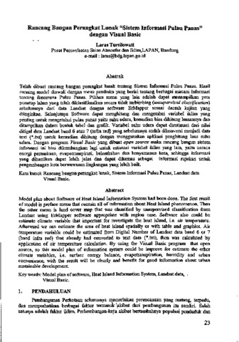Telah dibuat rancang bangun perangkat lunak tentang Sistem Informasi Pulau Panas. Hasil running model diawali dengan menu pembuka yang berisi tentang berbagai macam informasi tentang fenomena Pulau Panas. Pilihan menu yang lain adalah dapat menampilkan peta penutup lahan yang telah diklasifikasikan secara tidak terbimbing (unsupervised classification) sebelumnya dari data Landsat dengan software ErMapper sesuai daerah kajian yang diinginkan. Selanjutnya Software dapat menghitung dan mengetahui variabel iklim yang pentmg untuk mengetahui Pulau Panas yaitu suhu udara, kemudian bisa dihitung luasannya dan ditampilkan dalam bentuk tabel dan grafik. Variabel suhu udara dapat diestimasi dari nilai ditigal data Landsat band 6 atau 7 (infra red) yang sebelummya sudah dikonversi menjadi data text (*.txt) untuk kemudian dihitung dengan menggunakan aplikasi penghitung luas suhu udara. Dengan program Visual Basic yang dibuat open source maka rancang bangun sistem informasi ini bisa dikembangkan lagi untuk estimasi variabel iklim yang lain, yaitu neraca energi permukaan, evapotranspirasi, kelembaban dan kenyamanan kota, sehingga informasi yang dihasilkan dapat lebih jelas dan dapat dikemas sebagai informasi rujukan untuk pengembangan kota berwawasan lingkungan yang lebih baik