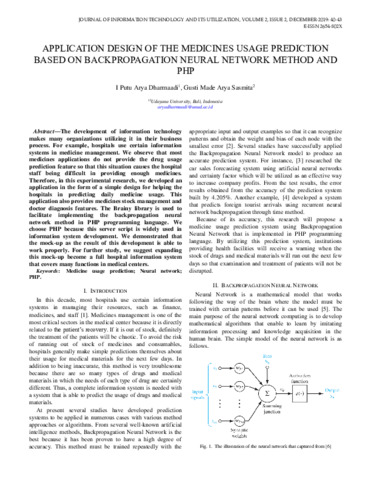 I Putu Arya Dharmaadi, I Putu Arya Dharmaadi and Gusti Made Arya Sasmita, Gusti Made Arya Sasmita Application design of the medicines usage prediction based on Backpropagation Neural Network Method and PHP. Journal of Information Technology and Its Utilization, VOLUME 2, ISSUE 2, December 2019 ISSN 2654-802X, 2 (2): 3. pp. 40-43. ISSN Journal of Information Technology and Its Utilization, VOLUME 2, ISSUE 2, December 2019 ISSN 2654-802X