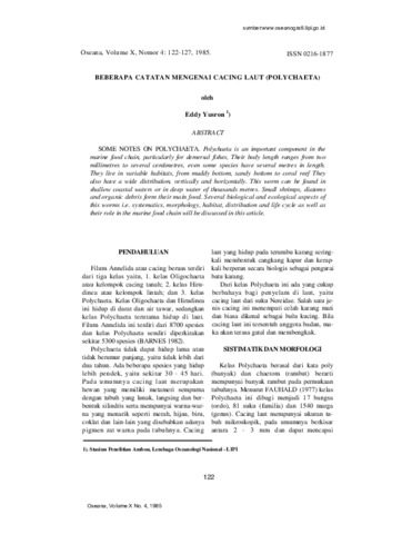 Eddy, Yusron (1985) Beberapa catatan mengenai cacing laut (Polychaeta). Oseana, X (4): -. pp. 122-127. ISSN 0216-1877