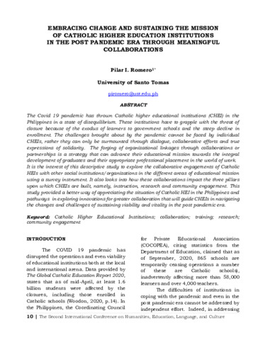 Pilar I. Romero (2022) Embracing change and sustaining the mission of catholic higher education institutions in the post pandemic era through meaningful collaborations. Proceeding The Second International Conference on Humanities, Education, Language and Culture (2nd ICHELAC). pp. 10-20. ISSN 2961-8258