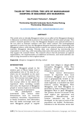 Ans Prawati Yuliantari and Sukapti (2022) Tales of two cities: the life of manggaraian diaspora in Makassar and Samarinda. Proceeding The Second International Conference on Humanities, Education, Language and Culture (2nd ICHELAC). pp. 119-126. ISSN 2961-8258
