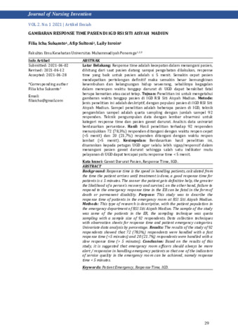 Filia Icha, Sukamto and Afip, Sultoni and Laily, Isroin Gambaran response time pasien di IGD RSI Siti Aisyah Madiun. Journal of Nursing Invention, 2 (1): 4. pp. 29-33. ISSN 2828-481X
