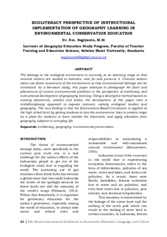 Sugiyanto (2022) Ecoliteracy perspective of instructional implementation of geography learning in environmental conservation education. Proceeding The Second International Conference on Humanities, Education, Language and Culture (2nd ICHELAC). pp. 21-32. ISSN 2961-8258