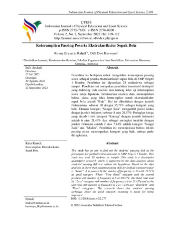Ronny, Brayntin Rahail and Dilli, Dwi Kuswoyo (2022) Keterampilan passing peserta ekstrakurikuler sepak bola. Indonesian Journal of Physical Education and Sport Science (IJPESS), 2 (2): 7. pp. 109-112. ISSN 2775-765x