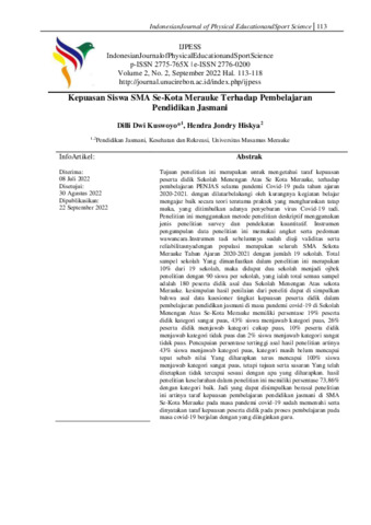 Dilli, Dwi Kuswoyo and Hendra, Jondry Hiskya (2022) Kepuasan siswa SMA se-kota Merauke terhadap pembelajaran pendidikan jasmani. Indonesian Journal of Physical Education and Sport Science (IJPESS), 2 (2): 8. p. 113. ISSN 2775-765x