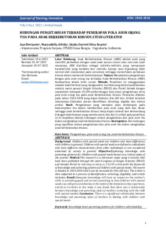 Aan, Devianto and Maryudella, Afrida and Idalia Gorreti Silva, Soares (2022) Hubungan pengetahuan terhadap penerapan pola asuh orang tua pada anak berkebutuhan khusus studi literatur. Journal of Nursing Invention, 3 (1): 1. pp. 1-6. ISSN 2828-481X
