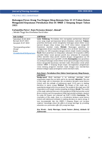 Farhandika, Putra and Bayu, Purnama Atmaja and Ahmad, Ahmad (2022) Hubungan peran orang tua dengan sikap remaja usia 15-19 tahun dalam mengambil keputusan pernikahan dini di SMKN 2 Simpang Empat tahun 2021. Journal of Nursing Invention, 3 (1): 3. pp. 16-21. ISSN 2828-281X