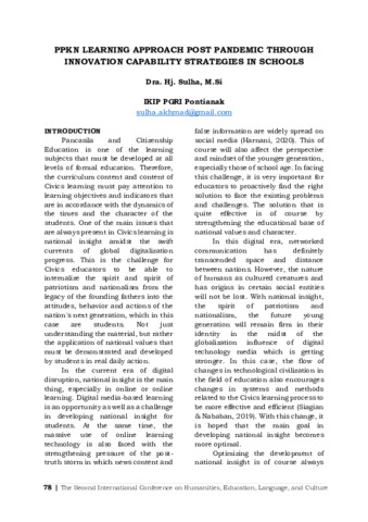 Sulha (2022) PPKN learning approach post pandemic through innovation capability strategies in schools. Proceeding The Second International Conference on Humanities, Education, Language and Culture (2nd ICHELAC). pp. 78-88. ISSN 2961-8258