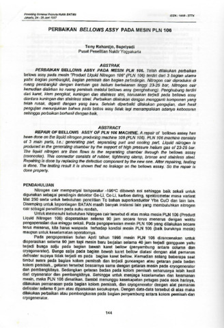 Telah dilakukan perbaikan belows assy pada mesin 'Product Liquid Nitrogen 106" (PLN 106) terdiri atas 3 bagian utama yaitu: bagian pembangkit, bagian pemisah dan bagian pendingin. Nitrogen cair diproduksi di ruang pembangkit dengan bantuan gas helium bertekanan tinggi 23-25 bar, Nitrogen cair kemudian dialirkan ke ruang pemisah melalui bellows assy (penghubung). Penghubung terdiri dari karet, klem pengikat, kuningan dan stainless stel, kerusakan terjadi pada bellows assy diantara kuningan dan stainless steel. Perbaikan dilakukan dengan mengganti komponen yang telah rusak, diganti dengan yang baru. Setelah diperbaiki dilakukan pengujian, dari hasil pengujian menunjukkan bahwa pada bellos assy tidak lagi menampakkan adanya kebocoran sehingga perbaikan berhasil dengan baik.