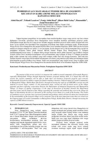 Tujuan kegiatan pengabdian ini merupakan buat memberdayakan warga warga pesisir tepi laut selatan Kabupaten Gorontalo spesialnya Desa Huangobotu lewat kenaikan keahlian pembuatan proposal usaha. Diharapkan dengan aktivitas ini warga pesisir hendak sanggup membuat proposal usaha sendiri dengan baik serta benar secara mandiri bila diperlukan buat pengajuan permintaan dana dalam pembuatan usaha. Pemberdayaan Warga Pesisir Desa Huangobotu Kecamatan Kabila Bone lewat kenaikan Kapasitas SDM UKM dicoba bersama mahasiswa dengan sebagian sesi ialah:( 1) sesi persiapan, dicoba dengan survey dini kemampuan Desa setelah itu penjajakan kerjsama antara pihak Jurusan Metode Industi dengan Desa Huangobotu,( 2) Tahapan penandatanganan kerja sama,( 3) tahapan dialog dengar komentar antara pihak Jurusan( regu dedikasi) dengan seluruh elemen Desa menimpa kemampuan serta permasalahan yang terdapat di Desa( 4) Tahapan penentuan judul selaku turunan dari tema dedikasi yang telah terdapat selaku hasil dari dengar komentar. Hasil aktivitas dedikasi kepada warga diperoleh kenaikan kemampuan serta kasus yang nantinya jadi bahan pertimbangan dalam keberlanjutan program dedikasi desa binaan. Salah satu permasalahan yang sangat berarti yang di angkat ialah Pemberdayaan Warga Pesisir Desa Huangobotu Kecamatan Kabila Bone lewat kenaikan Kapasitas SDM UKM.