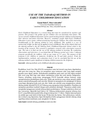 Zainal, Bakri and Dinn, Wahyudin (2022) Use of the tabaraq method in early childhood education. 12 Waiheru, 8 (1): 5. pp. 36-44. ISSN 2477-135X