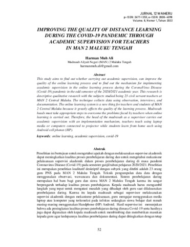 Harman, Muh Ali (2022) Improving the quality of distance learning during the Covid-19 pandemic through academic supervision for teachers in MAN 2 Maluku Tengah. 12 Waiheru, 8 (1): 7. pp. 52-56. ISSN 2477-135X