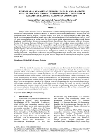 Nurhayati, Tine and Apriyanto A.J., Pauweni and Besse, Marhawati (2022) Peningkatan kemampuan berwirausaha di masa pandemi melalui program economy training di desa limehe Barat kecamatn Tabongo Kabupaten Gorontalo. Jurnal Abdimas Terapan, 1 (2): 4. pp. 39-41. ISSN 2798-6624