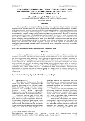 Di era globalisasi ini masyarakat kurang memiliki hasrat kepedulian dengan arsitektur tradisional membuat banyak arsitektur tradisional dibongkar dan disulap menjadi arsitektur modern karena mengikuti perkembangan zaman, demi kepentingan bisnis dan kekuasaan, padahal sejatinya sejarah adalah kenangan yang terindah yang syarat dengan nilai sebagai penciri identitas. Oleh karena itu sangat penting pendampingan masyarakat Jawa Tondano Desa Reksonegoro dalam identifikasi keaslian rumah Jaton. Kegiatan ini diharapkan mampu mencapai hasil berupa: 1. Teridentifikasinya keaslian (tangible dan intangible) rumah Jaton pada rumah Jaton baik yang sudah tercatat sebagai benda cagar budaya maupun yang masih dalam proses pendataan oleh tim BPCB, selanjutnya dapat menjadi masukan tim BPCB dalam menentukan kriteria penetapan benda cagar budaya kedepannya; 2. Teridentifikasinya kesadaran masyarakat Jaton terhadap pemahaman nilai-nilai sejarah dan budaya yang terekspresi pada rumah tinggalnya, sehingga dari hasil kegiatan ini diharapkan dapat menumbuhkan/meningkatkan kesadaran dan kecintaan terhadap artefak rumah Jaton sebagai bekal menghadapi era globalisasi.