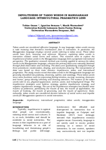 Tobias Gunas and Ignatius Semana and Manik Warmadewi (2022) Impoliteness of taboo words in Manggaraian language: intercultural pragmatics lens. Proceeding The Second International Conference on Humanities, Education, Language and Culture (2nd ICHELAC). pp. 135-146. ISSN 2961-8258