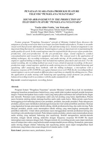 Unzila Alifitri, Nabila and Ade, Wahyudin (2020) Penataan suara pada produksi feature televisi “Pengelana Nusantara”. Jurnal Ilmiah Teknik Studio, 5 (1): 4. pp. 47-57. ISSN 2460-9153
