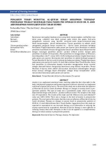 Farhandika, Putra and Tika, Sari Dewy and Ahmad, Junaidi (2021) Pengaruh terapi murottal Al-Qur’an Surah Arrahman terhadap perubahan tingkat kecemasan pada pasien pre operasi DI RSUD DR. H. Andi Abdurrahman Noor Kabupaten Tanah Bumbu. Journal of Nursing Invention, 2 (2): 9. pp. 143-149. ISSN 2828-481X