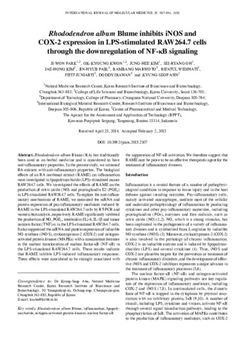 Ji-Won, Park and Bambang, Marwoto and Rifatul, Widjhati and Fifit, Juniarti (2015) Rhododendron album blume inhibits iNOS and COX-2 expression in LPS-stimulated RAW264.7 cells through the downregulation of NF-κB signaling. International Journal of Molecular Medicine, 35 (4). pp. 987-994. ISSN https://pubmed.ncbi.nlm.nih.gov/25784296/