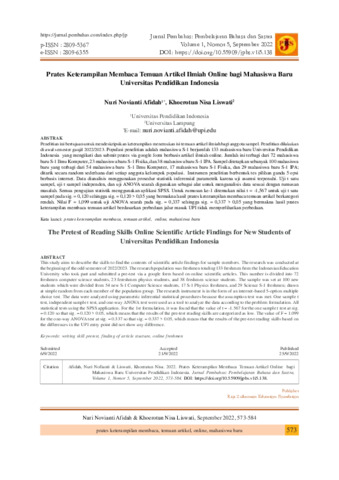 Nuri, Novianti Afidah and Khoerotun, Nisa Liswati (2022) Prates keterampilan membaca temuan artikel ilmiah online bagi mahasiswa baru Universitas Pendidikan Indonesia. Jurnal Pembelajaran Bahasa dan Sastra (Jurnal Pembahas), 1 (5): 2. pp. 573-584. ISSN 2809-5367