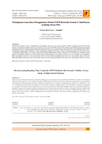 Triana, Hesti Sari and Asriani, Asriani (2022) Peningkatan lama baca menggunakan metode F247P bermedia format-1: Studi kasus terhadap siswa SMA. Jurnal Pembelajaran Bahasa dan Sastra (Jurnal Pembahas), 1 (5): 10. pp. 669-676. ISSN 2809-5367