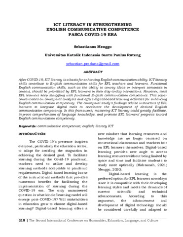 Sebastianus Menggo (2022) ICT literacy in strengthening english communicative competence pasca covid-19 era. Proceeding The Second International Conference on Humanities, Education, Language and Culture (2nd ICHELAC). pp. 218-226. ISSN 2961-8258