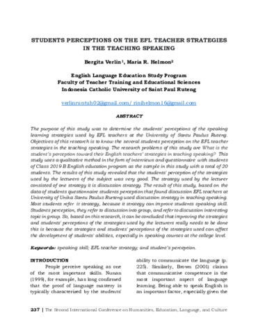 Bergita, Verlin and Maria, R. Helmon (2022) Students perceptions on the efl teacher strategies in the teaching speaking. In: The Second International Conference on Humanities, Education, Language, and Culture.