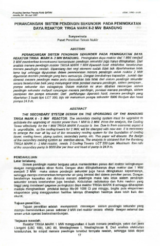 Peningkatan daya reaktor dari 1 MW menjadi2 MW memberikan konsekwensi kemampuan pendingin sekunder juga harus ditingkatkan. Dari analisis menara pendingin reaktor TRIGA MARK 1 MW diperoleh hasil efektivitas keseluruhan menara pendingin rendah. Dipandang dari segi ekonomi sudah tidak laik dipertahankan lebih lama lagi sehingga diputuskan dalam perencanaan menara pendingin untuk reaktor 2 MW digunakan menara pendingin yang baru semuanya. Dengan berubahnya kapasitas , jumlah dan dimensi menara pendingin maka perlu disesuaikan tata letak dari sistem pendingin sekunder secara keseluruhan baik yang menyangkut letak pondasi menara pendingin, sistem pemipaan , pompa sekunder dan sebagainya. Dalam makalah ini akan dibahas rancangan sistem pendingin sekunder meliputi rancangan menara pendingin, pondasi menara pendingin, sistem pemipaan dan pompa sekunder Dari perhitungan diperoleh hasil, menara pendingin yang diperlukan 2 buah tipe LCT 350, laju alir maksimum pompa sekunder 6000 liter/jam dan head pompa 24,9 m.