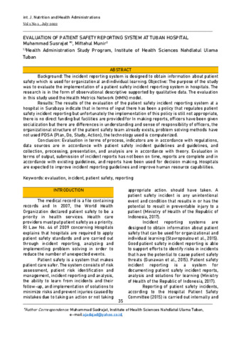 Muhammad, Susrajat and Miftahul, Munir (2022) Evaluation of patient safety reporting system at Tuban hospital. International Nutrition and Health Administrations Journal, 1 (1): 5. pp. 35-40. ISSN 2963-8453
