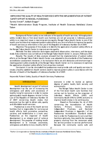 Surotul, Ilmiah and Adibah, Enggar (2022) Improving the quality of health services with the implementation of patient safety effort in Rengel Puskesmas. International Nutrition and Health Administrations Journal, 1 (1): 6. pp. 41-47. ISSN 2963-8453