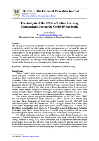 Yunita, Febriani (2022) The analysis of the effect of online learning management during the Covid-19 pandemic. The Future of Education Journal, 1 (1): 4. pp. 30-33. ISSN 2963-8135