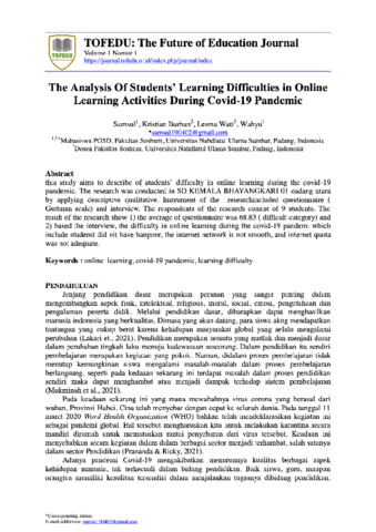 Samsul, Samsul and Kristian, Burhan and Lesma, Wati and Wahyu, Wahyu (2022) The analysis of students' learning difficulties in online learning activities during Covid-19 pandemic. The Future of Education Journal, 1 (1): 8. pp. 55-63. ISSN 2963-8135
