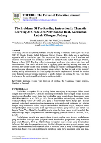 Desri, Rahmelda and Idil, Fitri Windi and Reka, Susanti (2022) The problems of pre-reading instruction in thematic learning at grade 2 SDN 09 Bandar Buat, Kecamatan Lubuk Kilangan, Padang. The Future of Education Journal, 1 (1): 10. pp. 69-75. ISSN 2963-8135